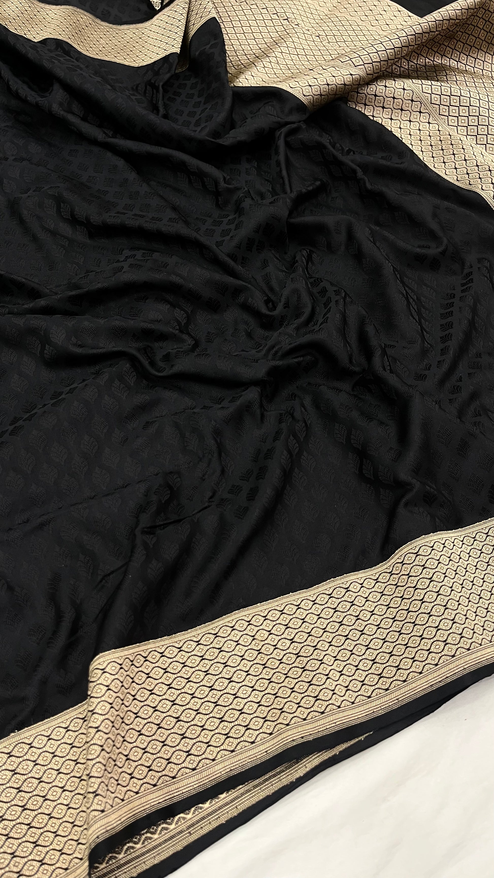 This Black Tanchue Brocade Pure Silk Saree is handwoven with beautiful banarasi kaduva weave and pure katan silk, using the traditional tanchue technique. The saree boasts intricate patterns and a smooth texture, making it a perfect choice for special occasions. Carefully crafted with expertise, this saree is a must-have for any saree lover.