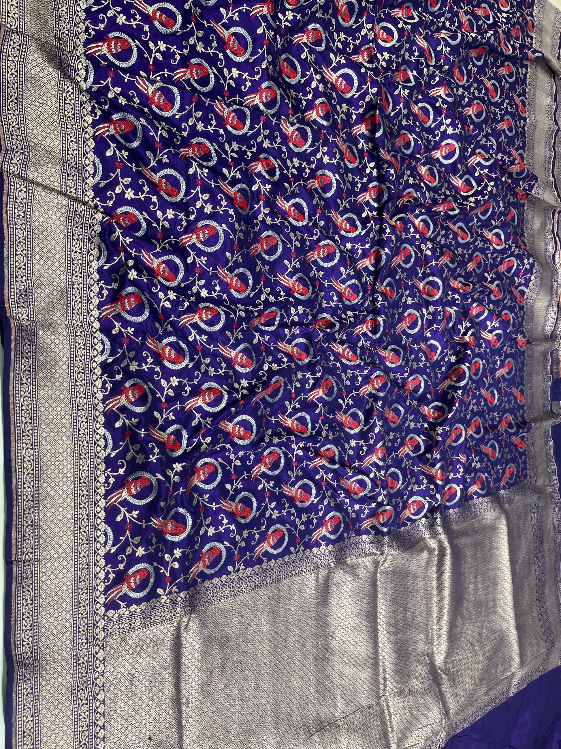 Introducing our Banarasi handloom shikargah animal design pure katan silk saree, featuring exquisite meenakari weaving and Sona roopa zari work. Made with premium quality silk, this saree is perfect for any special occasion. Stand out in style with its beautiful animal design and intricate weaving.