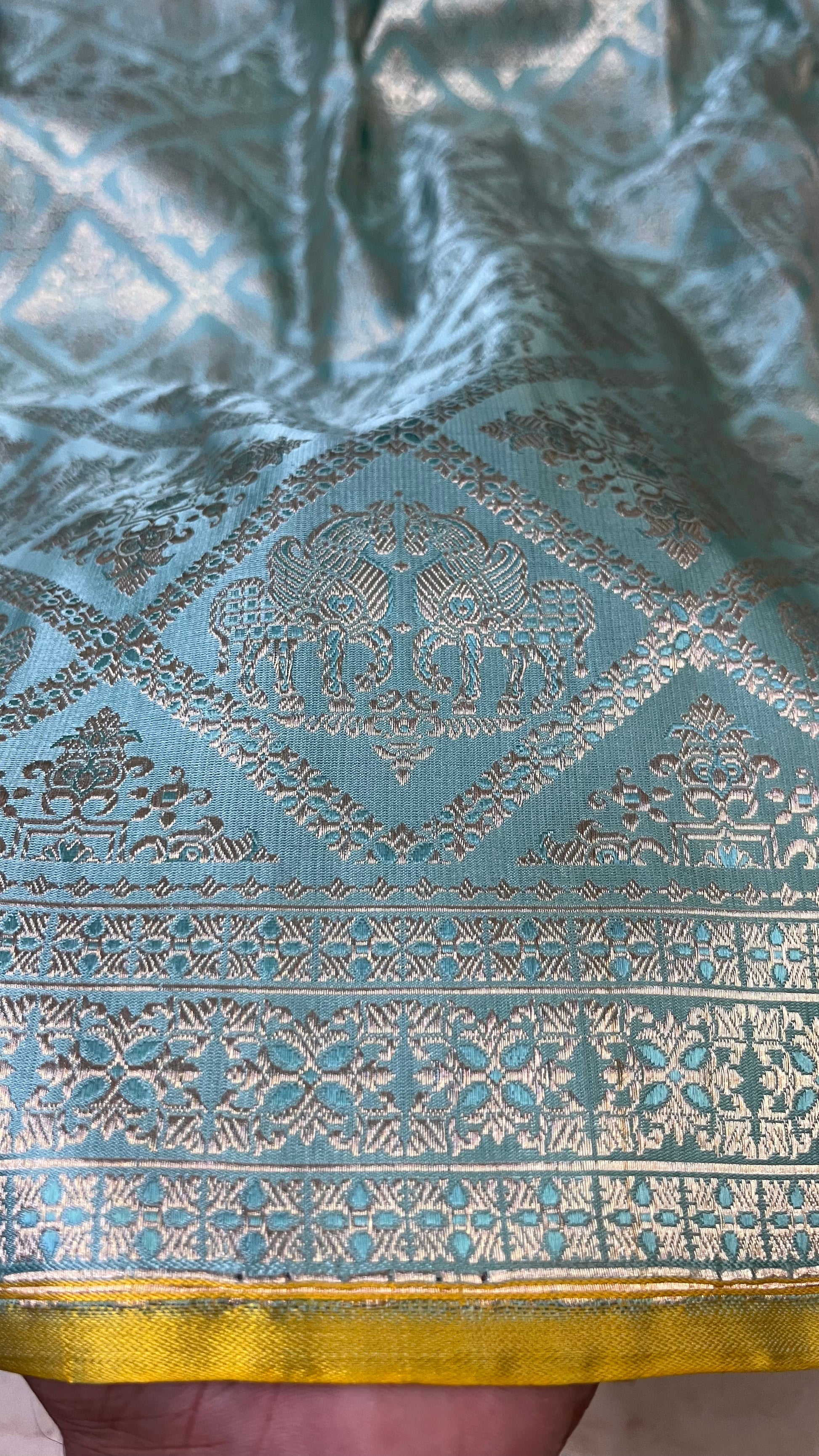 Experience the timeless elegance of our Blue Brocade Pattern Shikargah Pure Mashru Silk Saree, a masterpiece of traditional craftsmanship and luxury. Woven with intricate Shikargah motifs symbolizing royal hunting scenes, this saree beautifully combines heritage artistry with modern grace. The fabric is made from pure Mashru silk, known for its rich sheen and smooth texture, ensuring both comfort and sophistication.The saree features exquisite handwoven Reshmi Zari weaving work, adding a touch of regal brilliance to the overall design. Its yellow piping border provides a vibrant contrast, enhancing the saree’s visual appeal. Perfect for weddings, festive occasions, or grand celebrations, this saree reflects the perfect harmony of tradition, color, and craftsmanship.