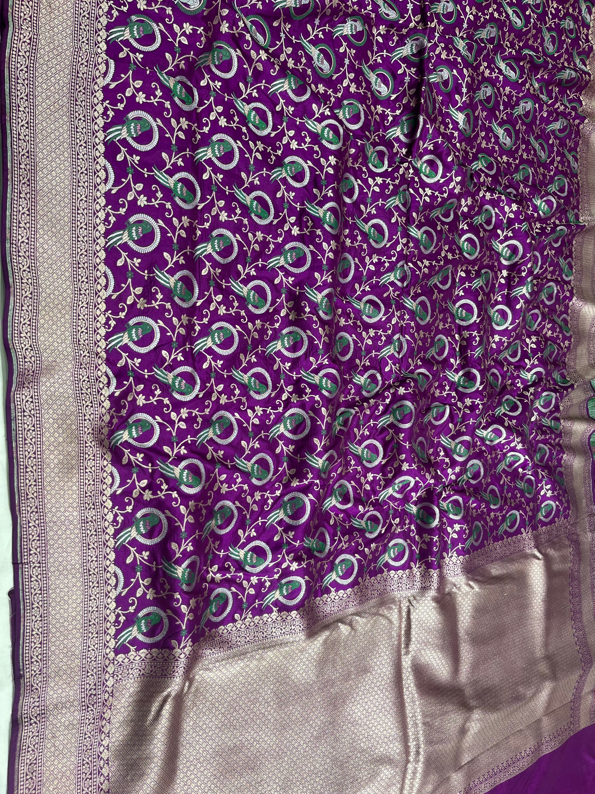 Introducing our Banarasi handloom shikargah animal design pure katan silk saree, featuring exquisite meenakari weaving and Sona roopa zari work. Made with premium quality silk, this saree is perfect for any special occasion. Stand out in style with its beautiful animal design and intricate weaving.