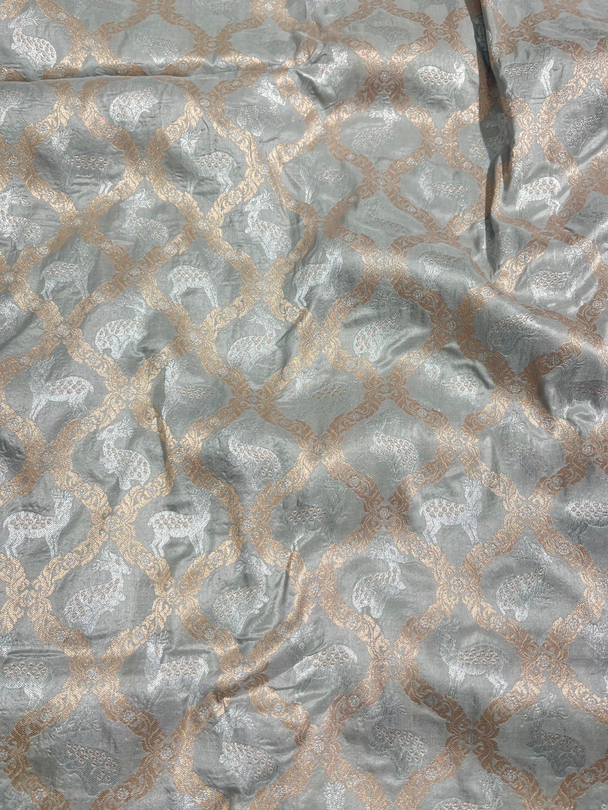 Introducing our Banarasi handloom shikargah animal design pure katan silk saree, featuring exquisite meenakari weaving and Sona roopa zari work. Made with premium quality silk, this saree is perfect for any special occasion. Stand out in style with its beautiful animal design and intricate weaving.